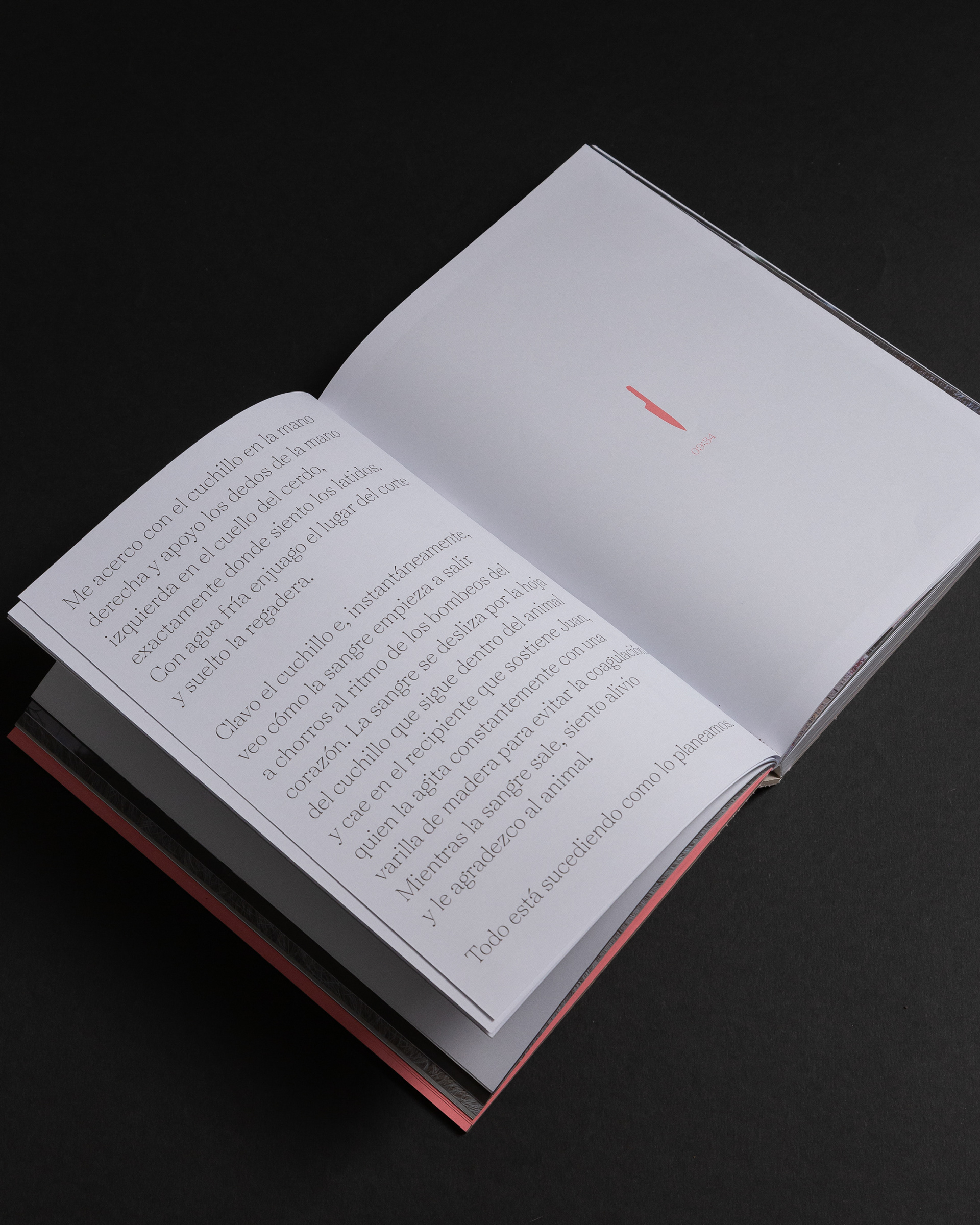 El libro narra la carneada de una chancha que el autor y un grupo de amigos crían en un campo de la provincia de Buenos Aires, durante todo un año, para elaborar embutidos de la más alta calidad. Cuando llegué al proyecto ya estaban tomadas todas las fotos (por Eduardo Torres y Joaquin Torres, con tono documental) y el texto redactado (por Juan Pedro Rastellino). Era un material impresionante. En la primera reunión con la editora surgió la idea de «esconder» algunas fotos y se me ocurrió que el libro tuviera un cuadernillo plegado y encuadernado sin refilar, en un papel de menor gramaje (más frágil), y que para acceder a las imágenes más explícitas el lector tenga que cortar las hojas con… algo. Recuerdo haberme ido de esa reunión muy contento de haber aportado ese concepto para un libro que sabíamos que iba a ser único, incluso antes de sentarme a tomar decisiones más gráficas como el formato, la elección tipográfica y la composición.